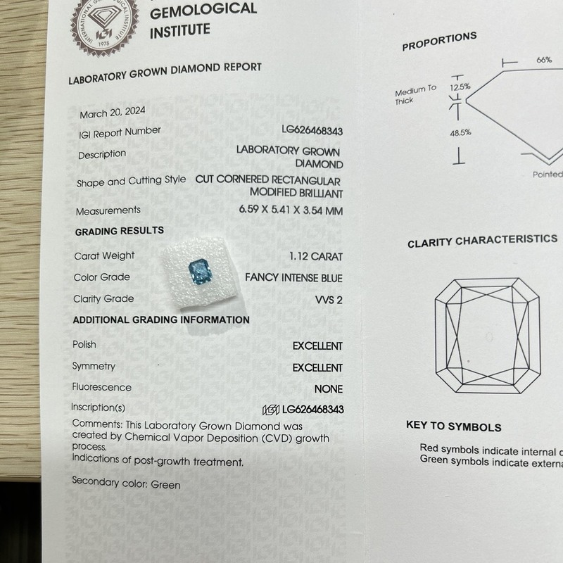1.12ct Diamante de laboratorio radiante cortado CVD azul intenso de lujo VVS2 2EX N IGI